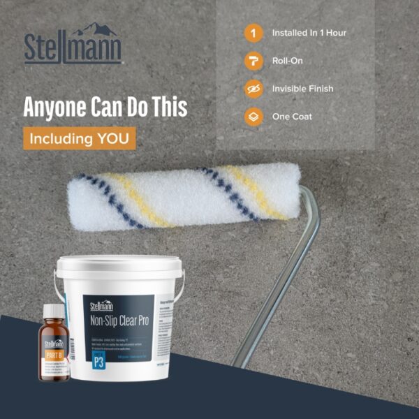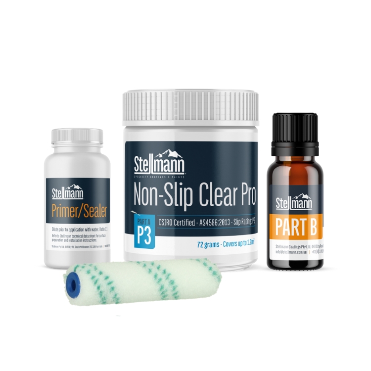 Stellmann Non-Slip Clear PRO P3 is Australia’s leading non-slip solution, now available at Epoxy Warehouse. It creates a durable, clear non-slip finish on a wide range of surfaces. Unlike traditional anti-slip treatments that can etch or damage the substrate, Stellmann Non-Slip preserves the integrity of your surfaces. Its advanced dual-component formula adheres to a wide range of materials, providing long-lasting protection. Plus, with independent CSIRO certification, you can trust in the quality and safety of our product for complete peace of mind. Must be applied with the supplied rollers. Do not use other rollers to avoid incorrect slip-ratings and finishes.